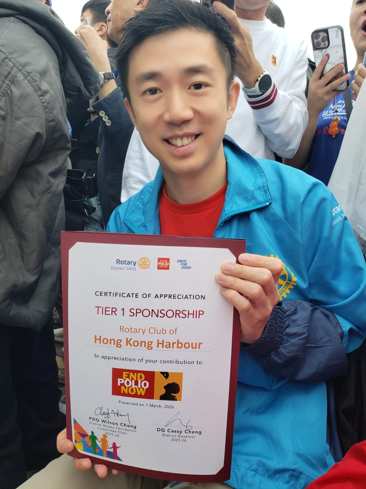 On March 1, a large delegation led by President David participated in Rotary Ultramarathon x End Polio Walk, organized by our District. A 50km relay team, managed by Past President Lily, comprised of: Past Presidents Jason, Webster and Mark, as well as two siblings and a cousin of Rotarian Joanna. The team managed to finish the 50km within 5 hours, and placed in the top one-third of all Rotary relay teams. Meanwhile, Rotarian Joanna joined Past Presidents Grace and Lily to cheerlead and participate in the shorter but festive End Polio Walk. Past President Lily was an organizing committee member, while Past President Webster, putting on his hat as Legislative Councillor, was one of the event’s guest of honors. Our Club was a Tier 1 supporter of End Polio Walk and a bronze supporter of the Ultramarathon.